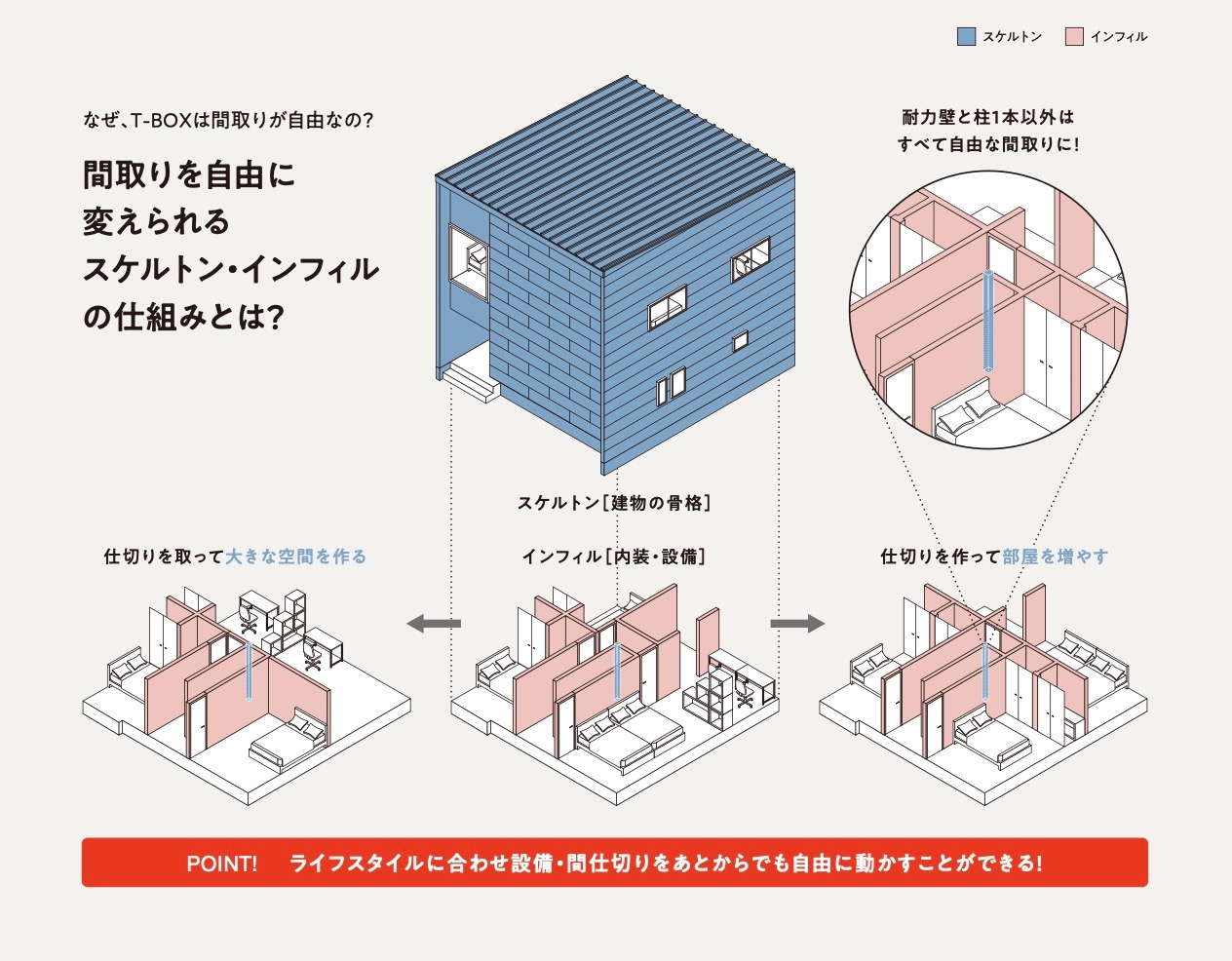 都会の喧騒から離れた静かな環境、子育てしやすいファミリー向け、趣味に没頭できる空間など、立地やライフスタイルに合わせた豊富なラインナップ。T-BOXは、ライフスタイルの変化に柔軟に対応でき、建てたあとでも間取りを変更することが可能です。16の個性から、あなたにぴったりのT-BOXを見つけて、自分らしい暮らしを無限に広げてください