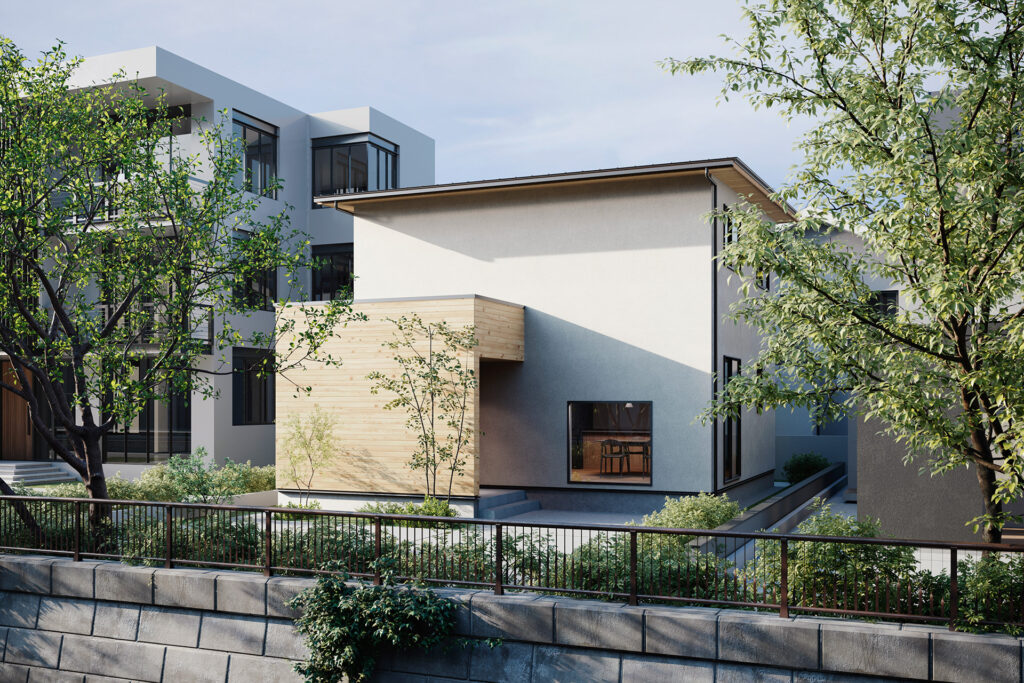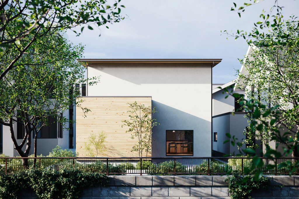 軒、下屋、木目の横ラインを揃えて、漆喰と木の素材感を引き立たせたシンプルなデザイン。