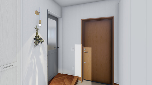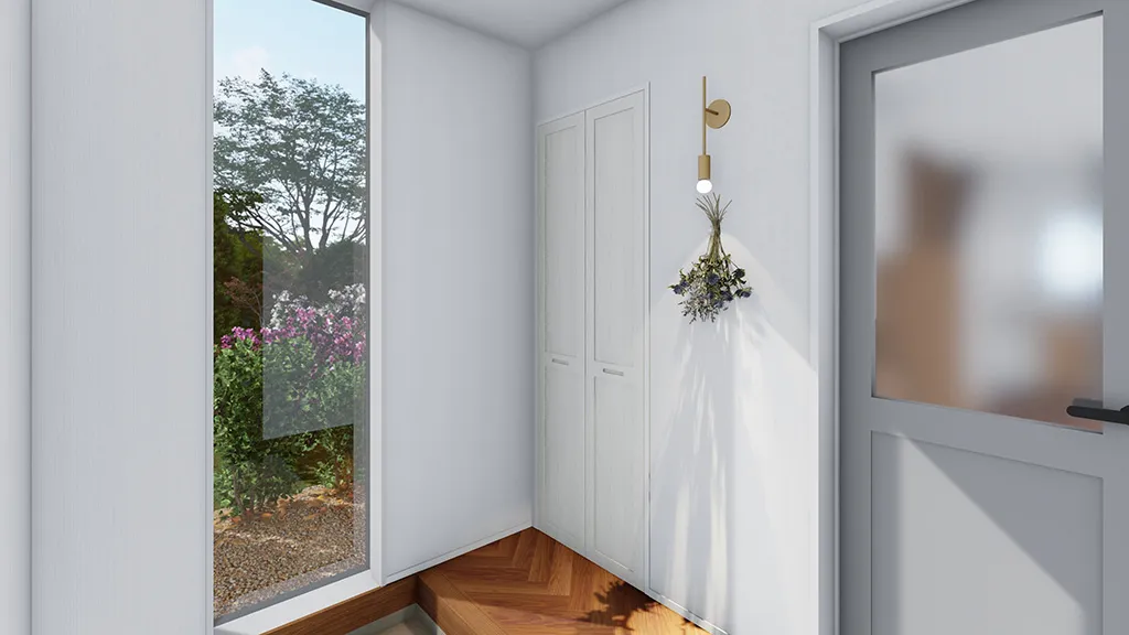 玄関扉を開けると、正面の窓から外の景色を眺められる、抜け感のあるエントランス。