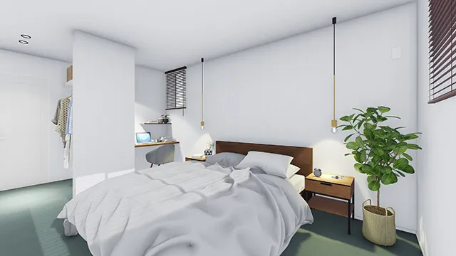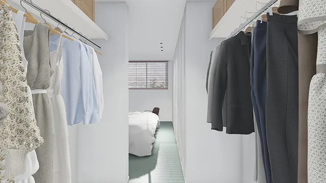 大きめのウォークインクローゼットを通ってメインベッドルームに入る配置が特徴的な間取り。オープンタイプとクローズタイプの2つの収納で、見せたいもの・隠したいもの、季節によって収納を使い分けできます。
