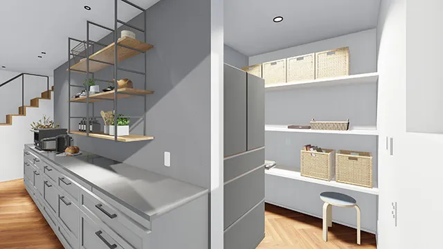 冷蔵庫を隠すことができるパントリーとキッチン。背面のカップボードスペースのおかげで収納力たっぷり。