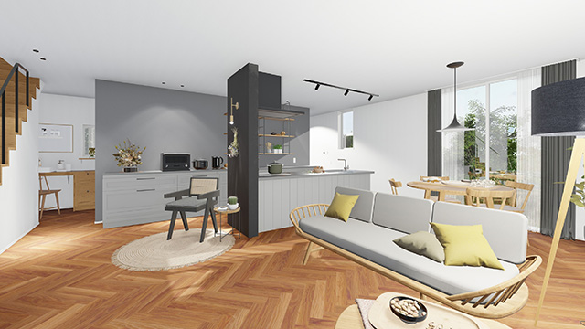自然素材の家をVRで360℃内見することができます。実際に家の中に入り、間取りを体感して住み心地や動線を確かめてください。
