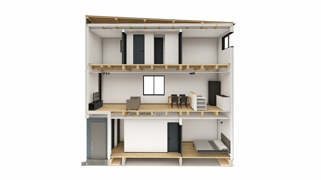 T-BOXを支える[T-Base 強震地中梁基礎]。許容応力度計算による、強靭で安定した基礎構造により、今後想定される極大地震や災害への性能を高めました。一般的な家は、基礎の構造によって間取りの自由が限られている中、T-BOXはスケルトンインフィル構造で、将来自由な暮らしのどんな変化にも対応した間取りの変更ができます。