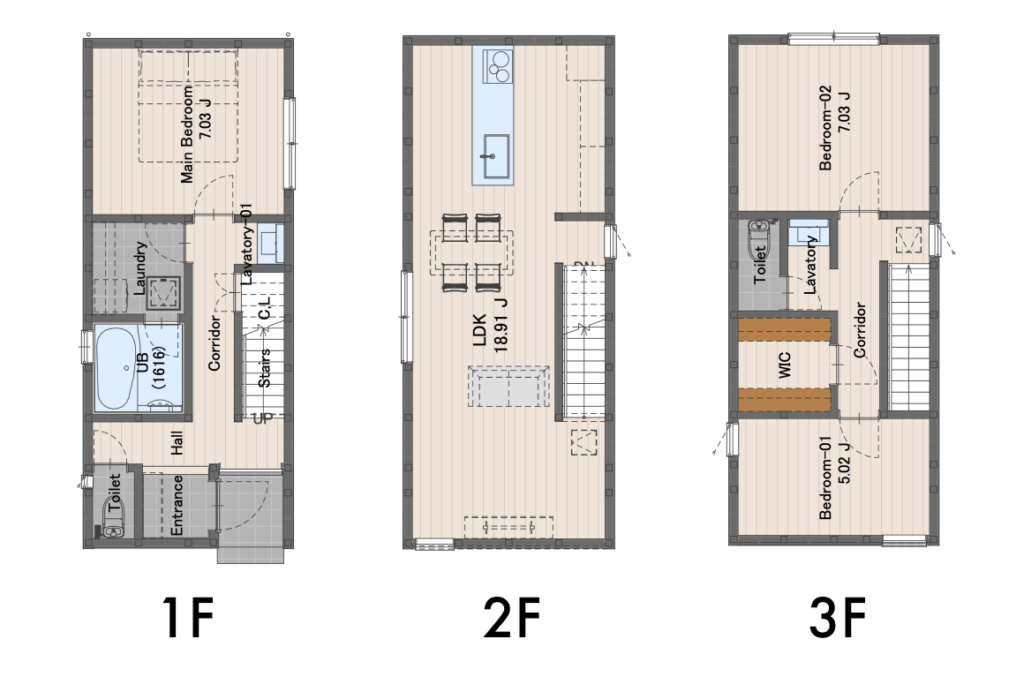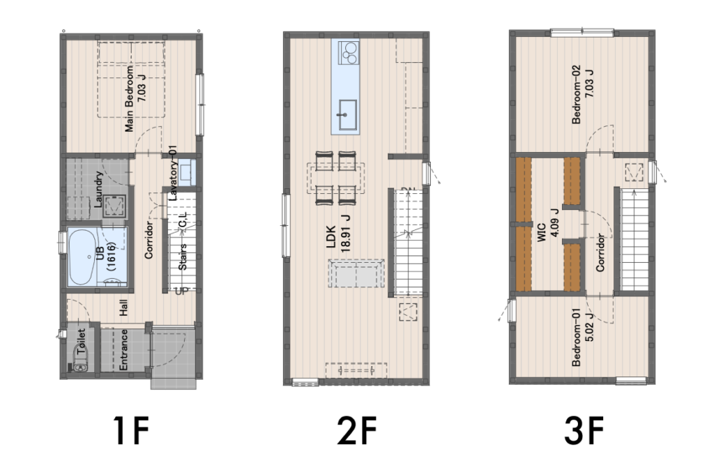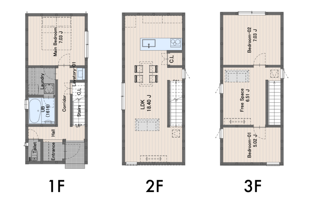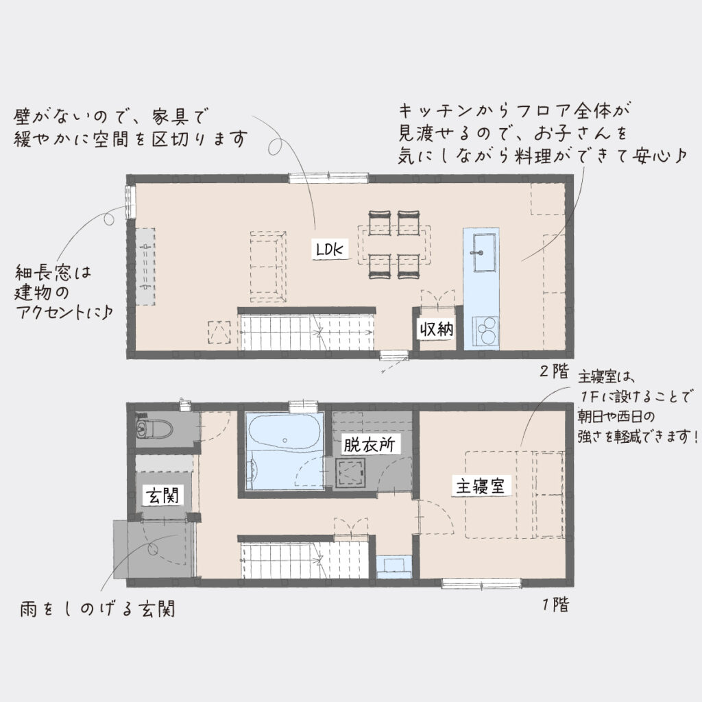 1Fには水回りと主寝室、2Fには家族が集まるLDK、3Fはプライベートスペースに。 家族との距離が離れないよう、家の中心を2Fにすることで、1Fと3Fのハブになるように設計。