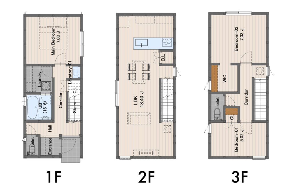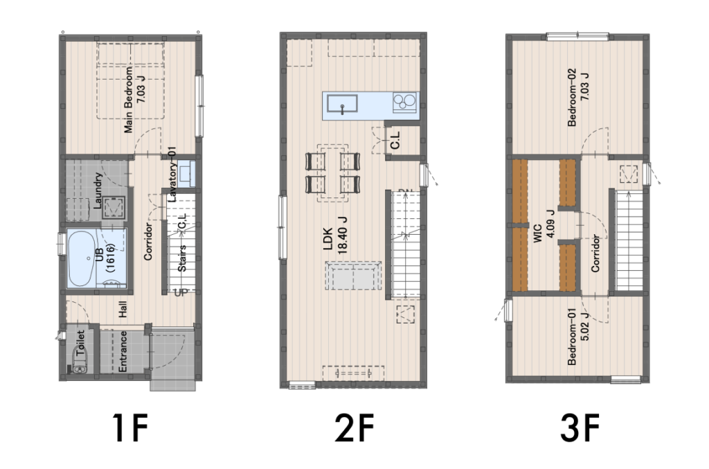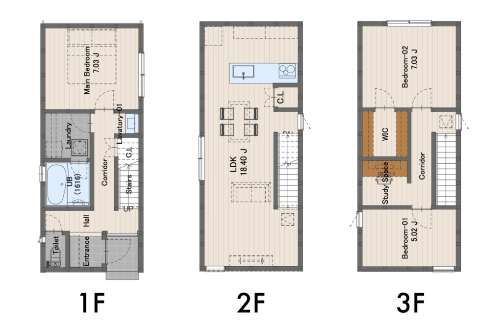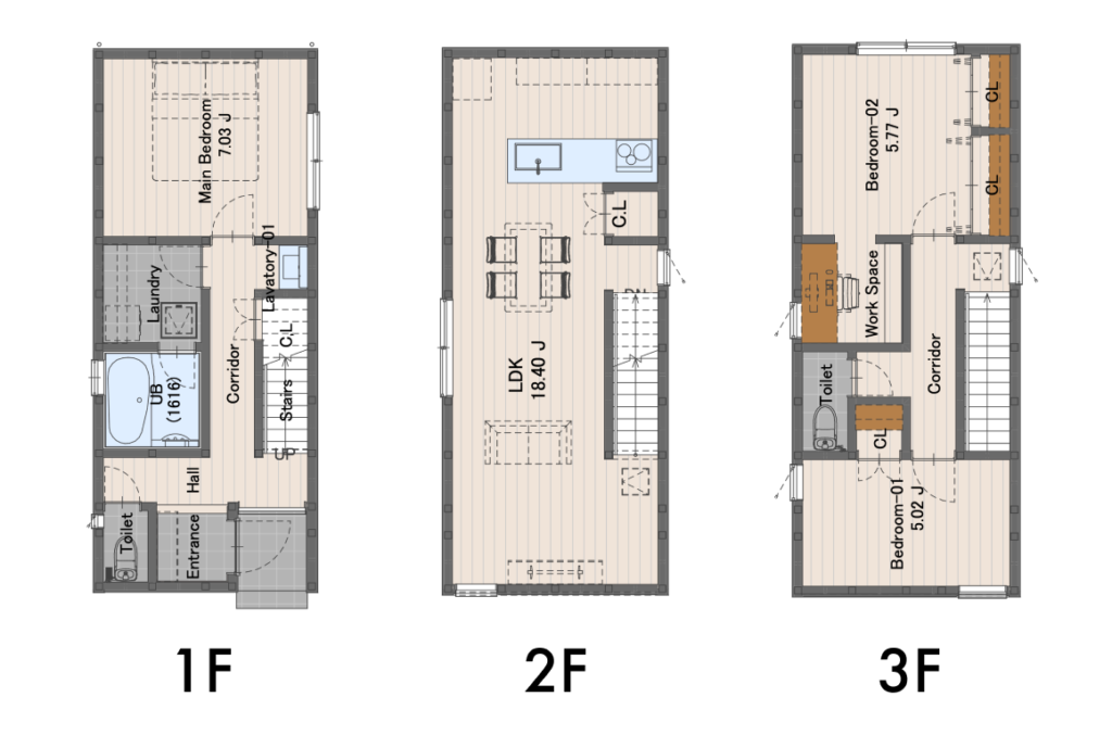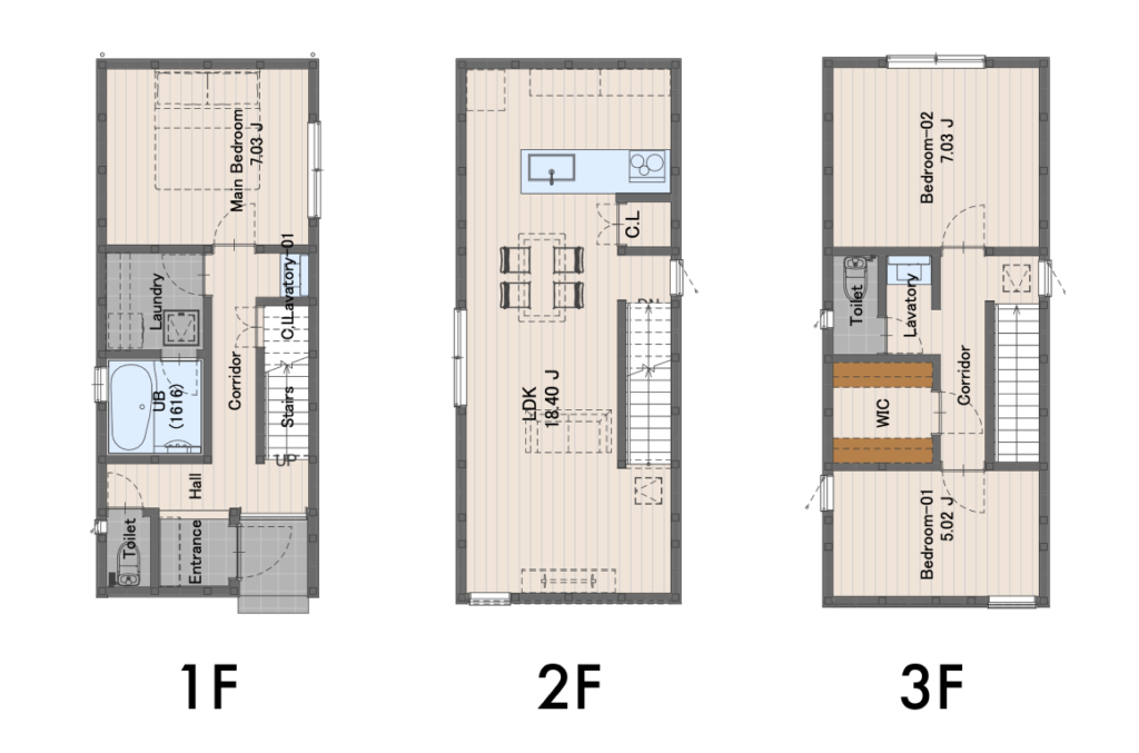1Fには水回りと主寝室、2Fには家族が集まるLDK、3Fはプライベートスペースに。 家族との距離が離れないよう、家の中心を2Fにすることで、1Fと3Fのハブになるように設計。