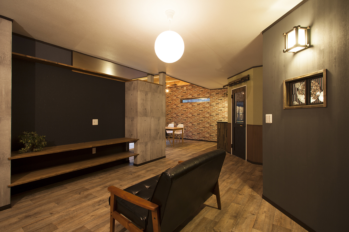 • 「好きなものにも囲まれて暮したい」というご要望をもとに、全体のまとまりを意識して内装のコーディネートを行ないました。TV周りはダークトーンでまとめています。