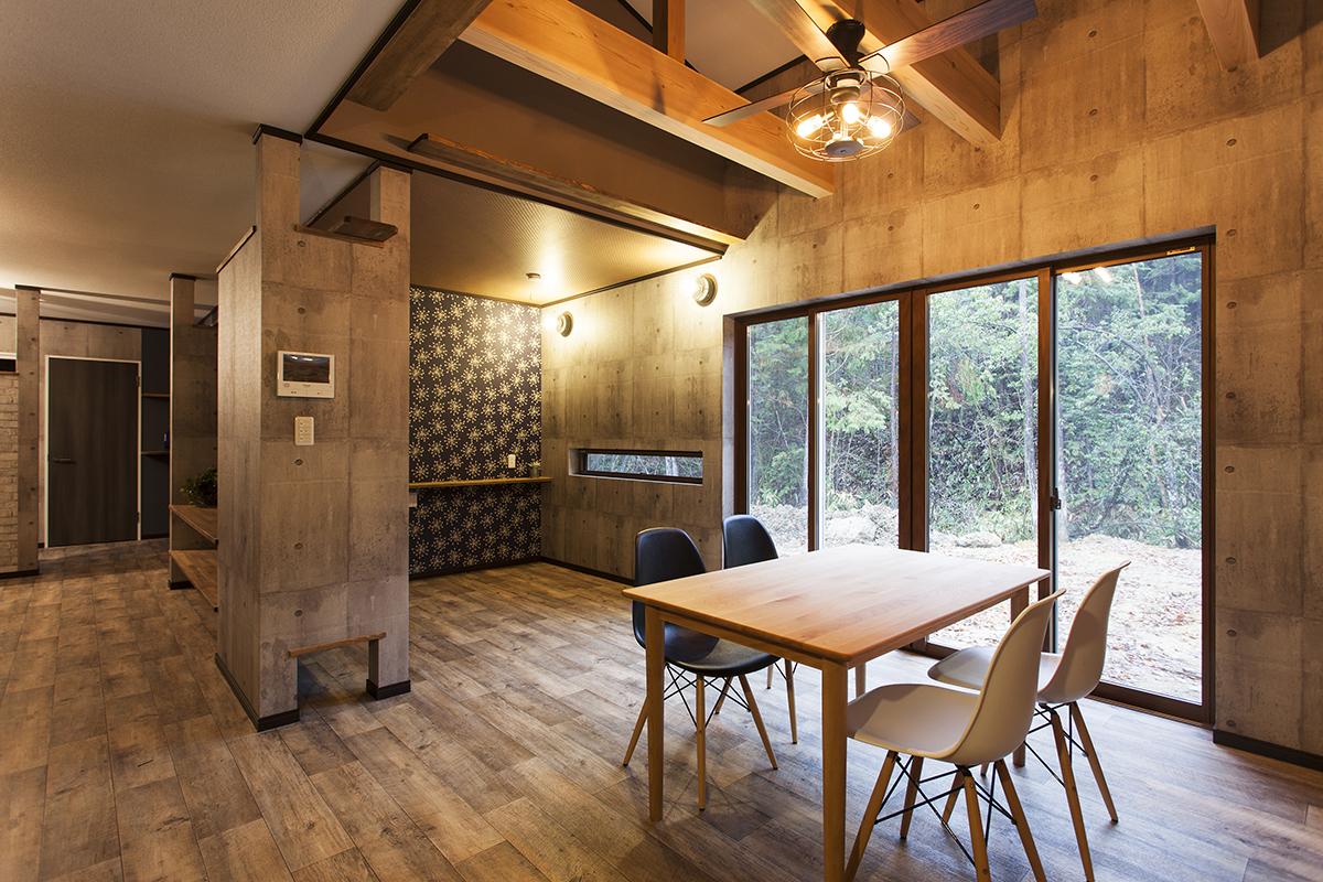 • 高天井と大開口で庭とつながる開放的なリビングダイニング。光と風を取り込み、心地よく過ごせる空間です。キャットウォークを設け、ペットも快適に共存できる工夫を施しています。