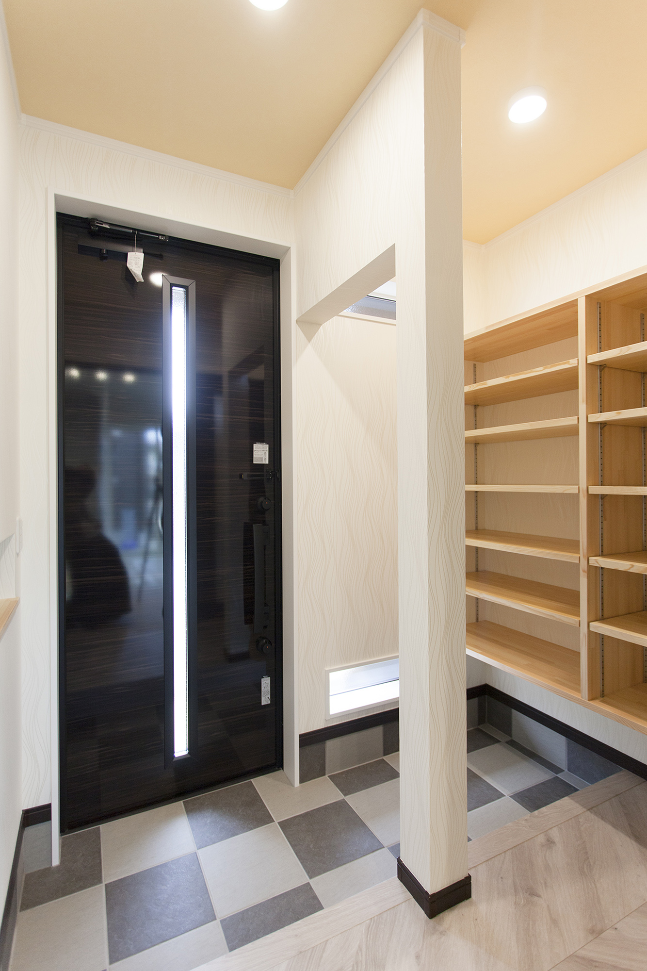• 玄関には一面の靴棚を設けました。足元には明かり取りの窓を設けて閉塞感のない空間に。