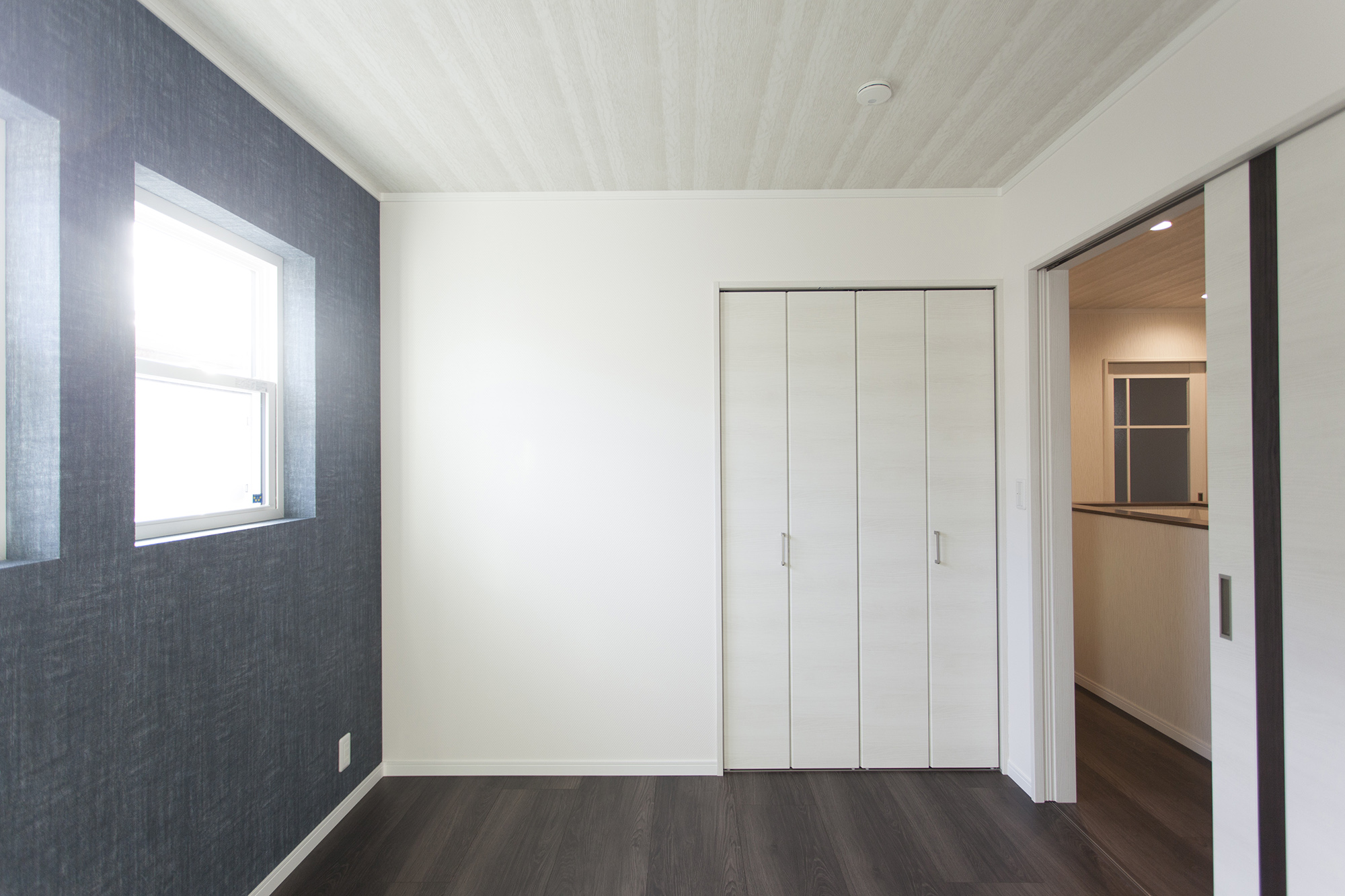 • 小上りの和室は旦那様がこだわ理のスペース。モノトーンで正方形の畳を使うことでスタイリッシュな和室に仕上げています。壁のクロスも光の反射で柄の強弱がアクセントになるものを選びました。