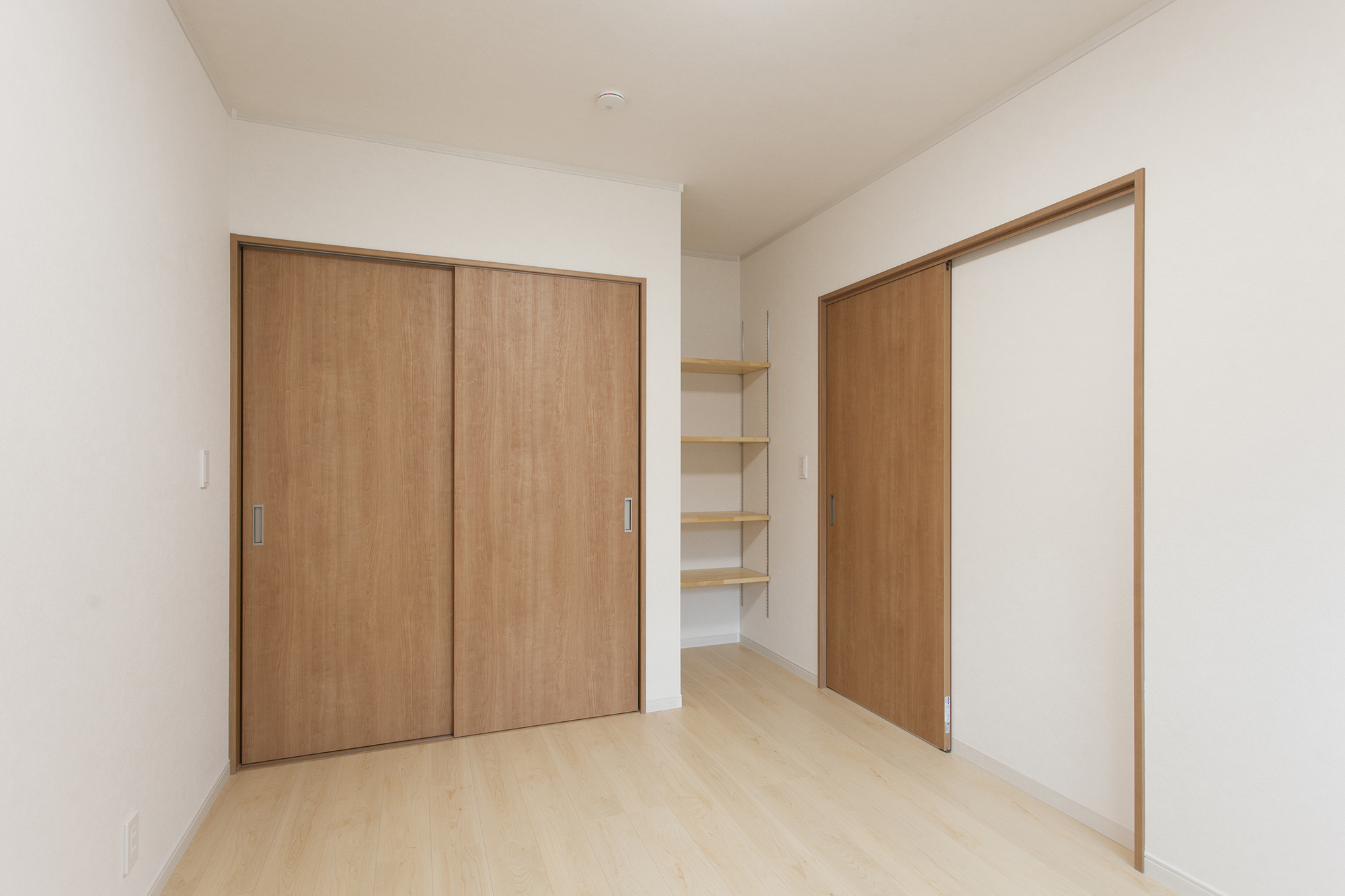 約14帖のLDKは、お孫さんやご友人を招いてもゆったりと過ごせる広さを確保しています。リビング部分の天井は約5m、高さがある事で実際以上に広さを感じます。寝室にはオープン棚と奥行きのある造作収納を設け、使いやすさと収納力を両立。床は段差のないフラット設計、出入口は引き戸を採用するなどバリアフリーにも配慮しました。