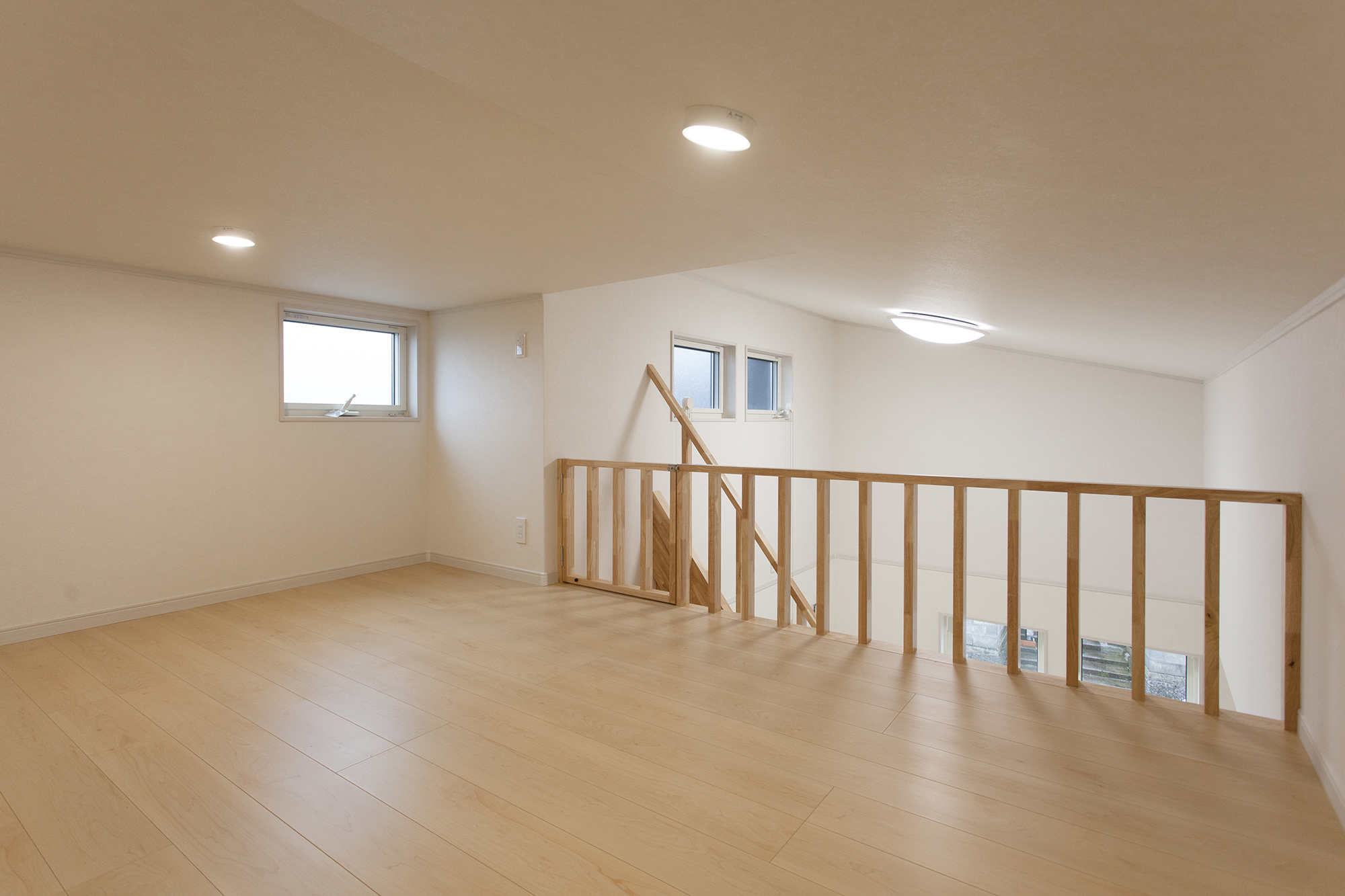 • 勾配天井にすることによってできた空間を活用してロフトを設けました。十分な広さがあるため、普段の使用頻度が低い物や季節物をたっぷり収納できます。