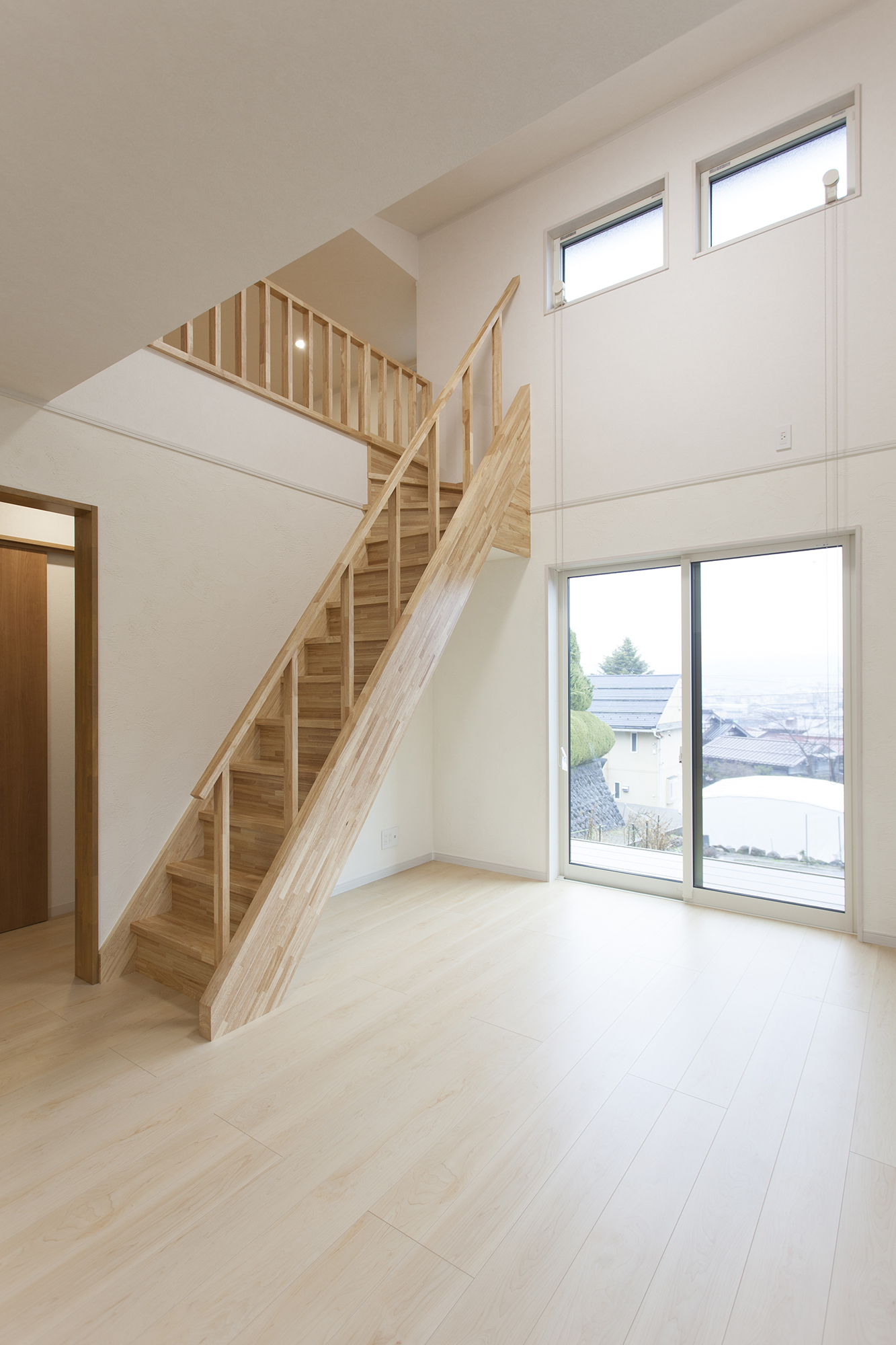 • リビングに入ってすぐに約5mの高さがある空間が広がります。ロフトへはリビングから上がりますが、手摺付きの階段を造りつけてあるので移動も安全です。