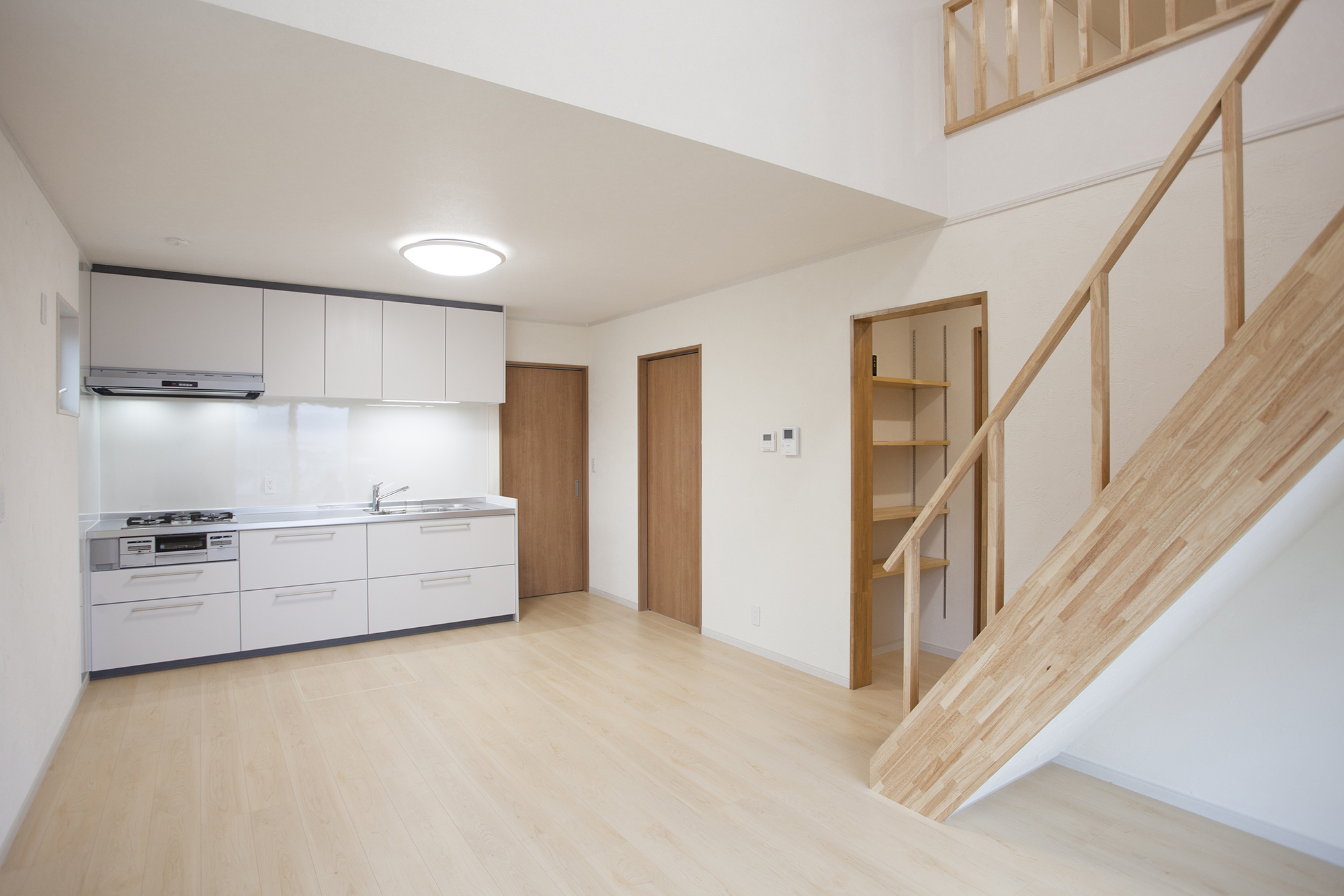 • 天井と壁はホワイト、床には明るい色のフローリングを採用し明るく広い室内になるようにプランしました。キッチンも空間と馴染みの良い白を選んでいます。