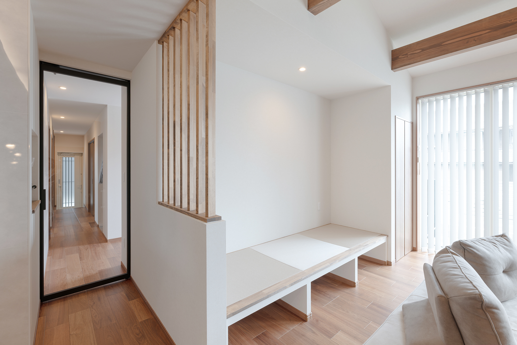 リビングの一角にはくつろぎのヌックを。玄関ホールを繋ぐ扉は大判ガラスをはめ込んだミタラップのクアドロスリムを設置しました。廊下の奥まで視線が抜けて家全体に一体感をもたらしています。 -