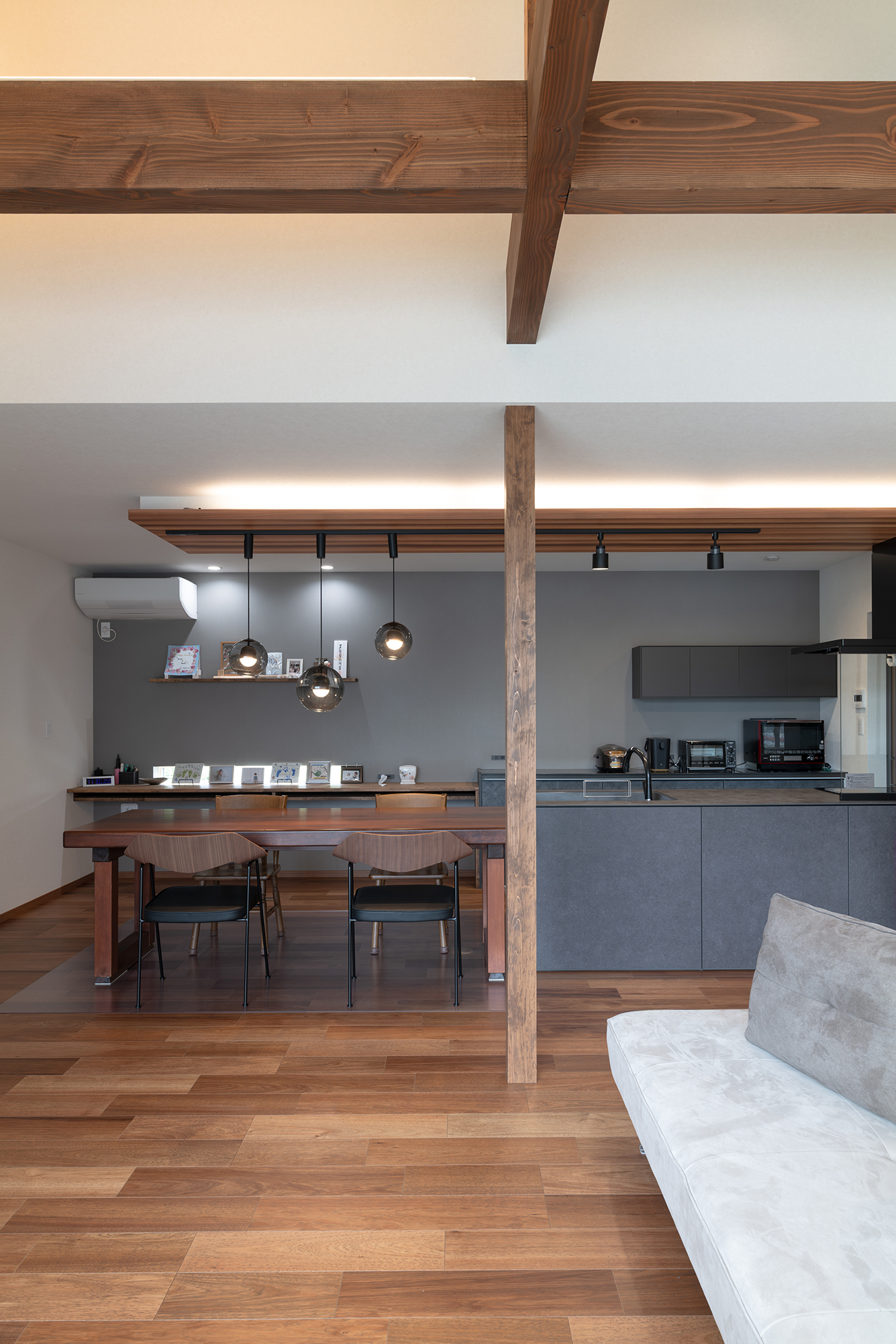 キッチンはLIXILのリシェルSiをチョイス。落ち着いたグレートーンのカラーでまとめ、下がり天井部分の木目でアクセントをつけています。 -