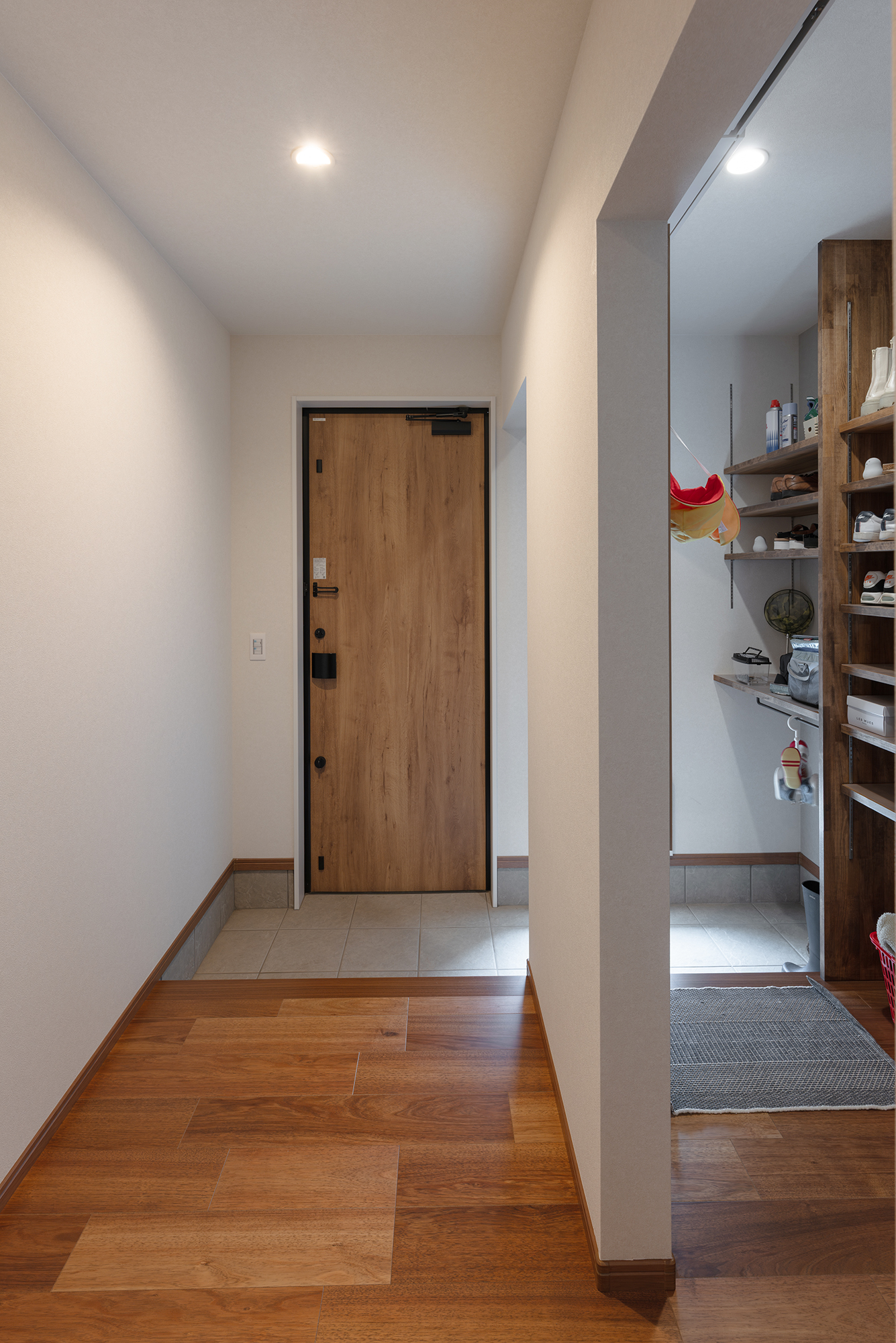 玄関は土間部分をしっかり確保。シューズクローゼット+回遊動線を設けて、いつもスッキリとお客様をお迎えできるようにしています。