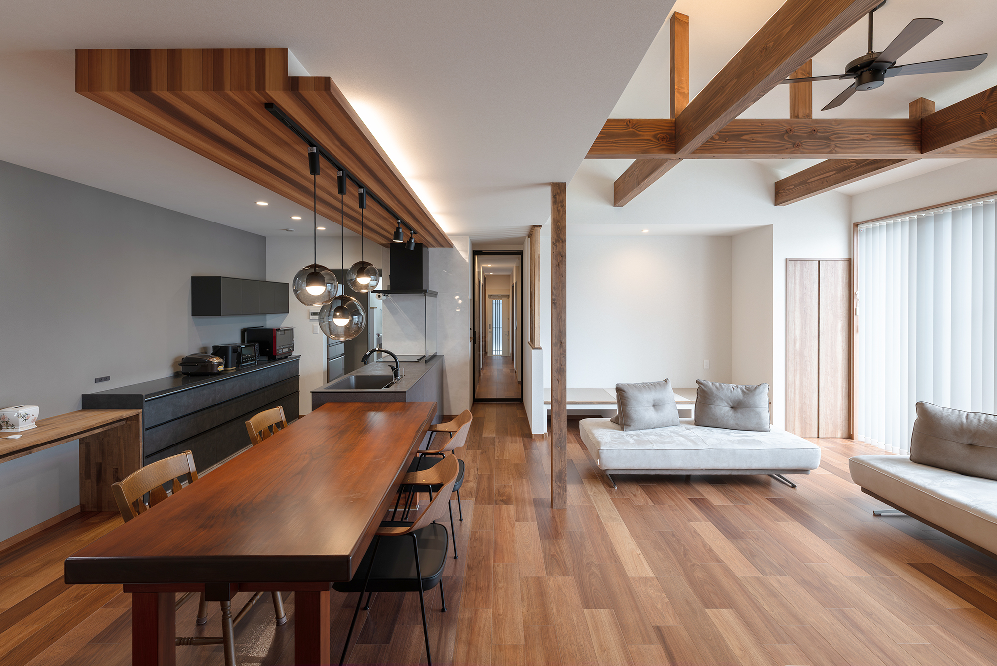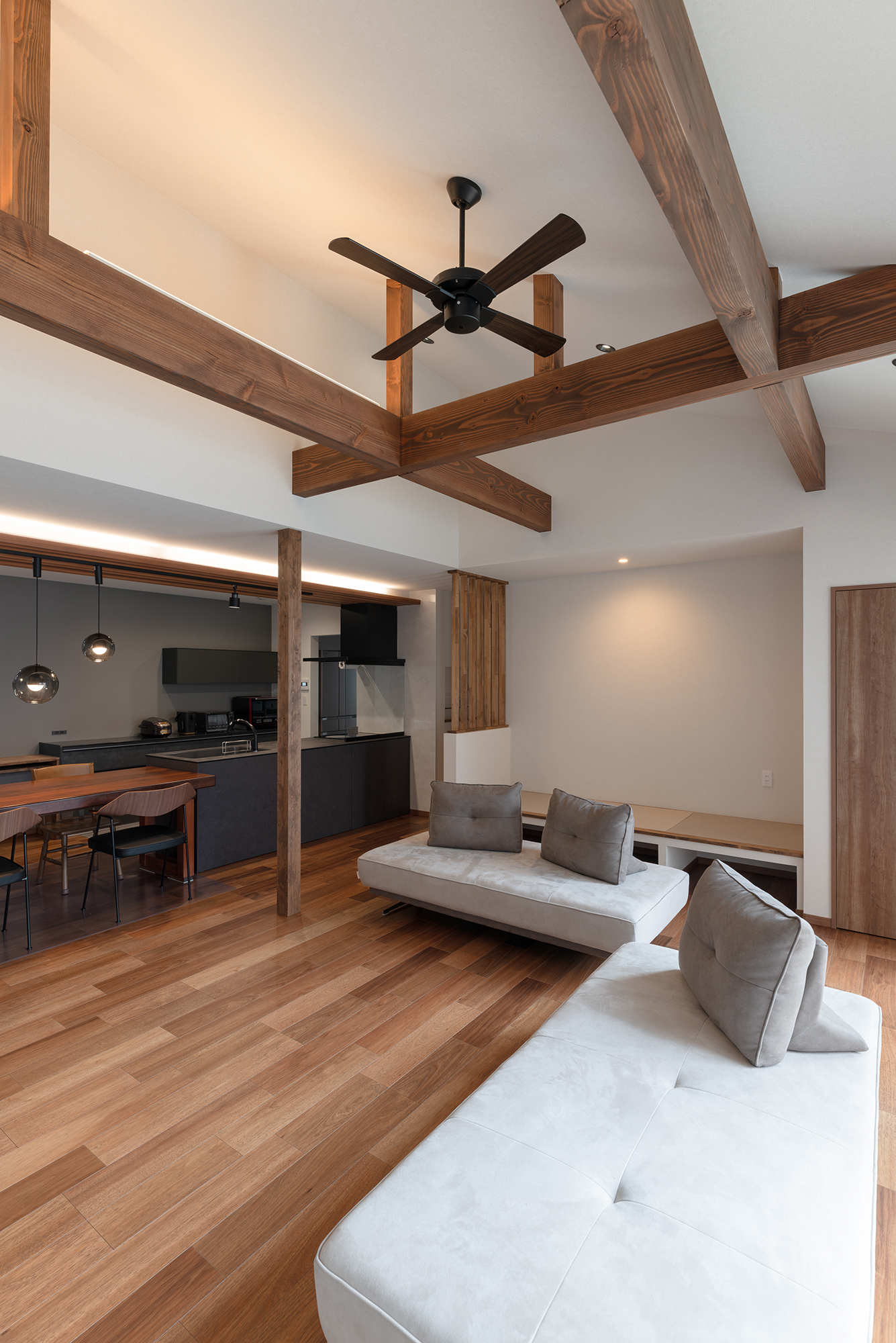 リビングは勾配天井を採用し、柱や壁を最小限にしたことで開放感のある空間をつくりました。梁があることで空間にメリハリが生まれ、デザイン性がUPしています。 -