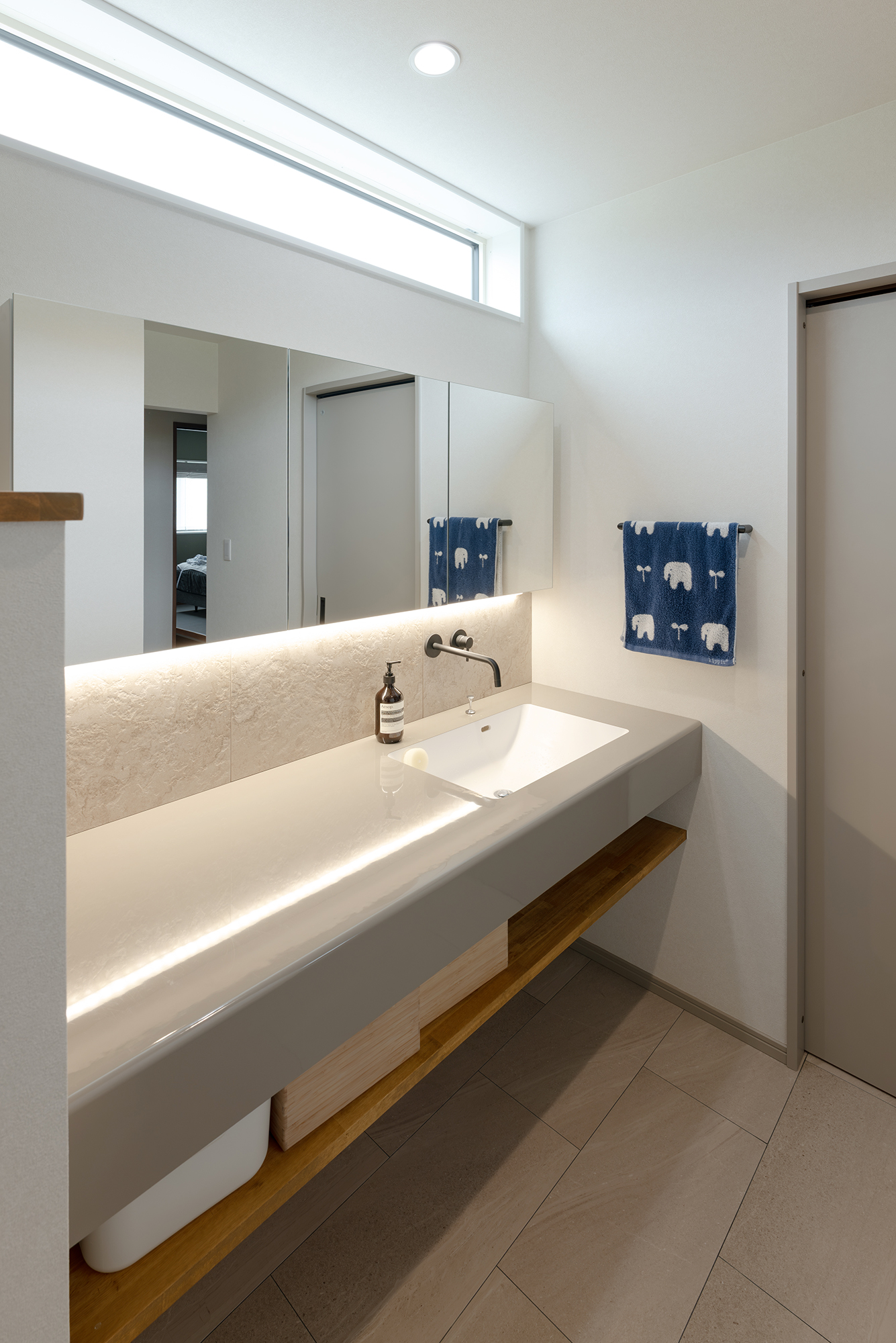 広々としたオーダー洗面台は、皆が忙しい朝の時間もゆったり使えます。天井付近の採光窓と、ミラー下の間接照明で柔らかな印象に。 -