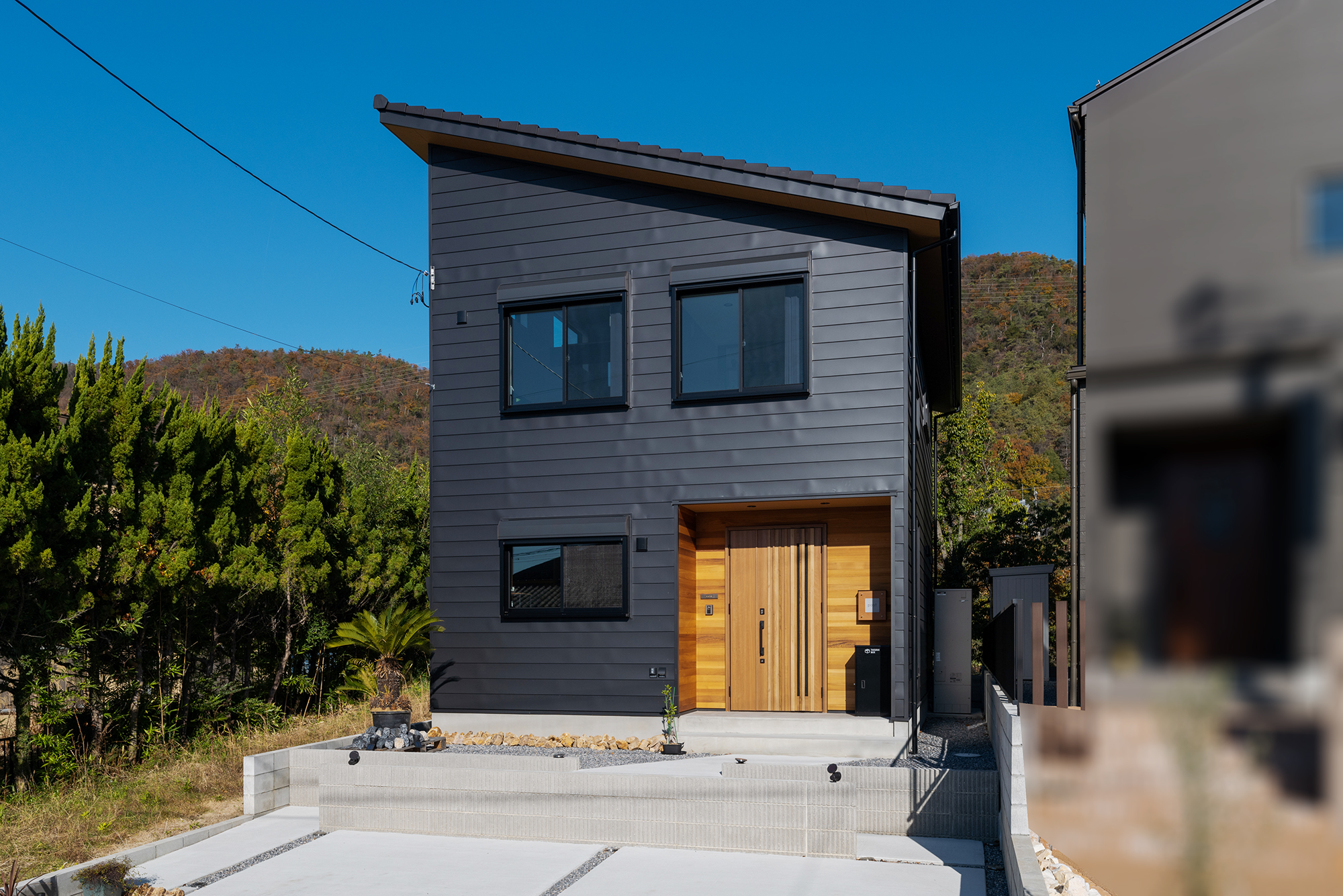外観は内観と合わせてシックな雰囲気に。屋根はブラックなので太陽光パネルも馴染んでいます。オール電化+蓄電池を設置していますので災害時もしばらく電力を確保する事ができるようになっています。