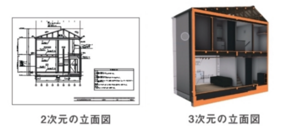 しかし、立体CGによる3次元の図面なら、一つ一つの建材がCGで立体化されるため、視覚的にイメージしやすいというメリットがあります。