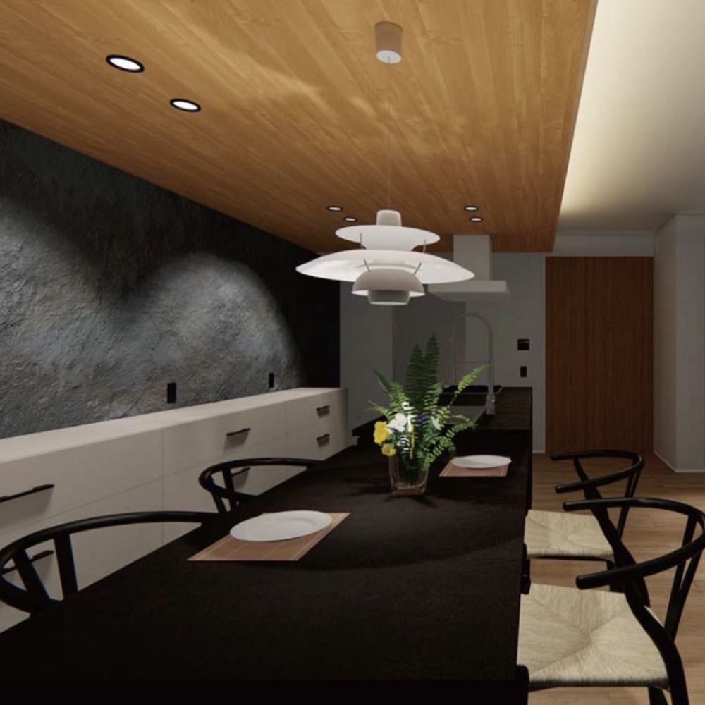 主役にしたい家具があれば、どんな色や素材の床材が合うか提案。ダイニングテーブルが決まればその真ん中に照明が落ちるように、家具に合わせて空間設計をします。